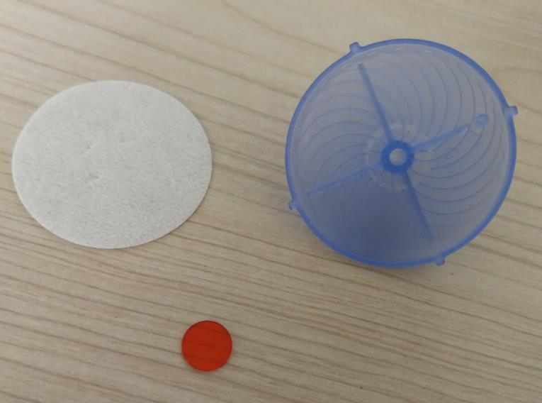 本項目共完成6個零件的自動裝配,其中有2個注塑件上傘蓋下傘蓋,一PVC片直徑11.5mm厚0.9mm名稱分流片,一直徑40mm無紡布片名稱濕化體,一段導(dǎo)水殼一段導(dǎo)水芯。自動裝配過程:轉(zhuǎn)盤式多工位方式,涉及到兩個塑料料扣合,導(dǎo)水芯導(dǎo)水殼插裝,濕化體模切后自動就位。